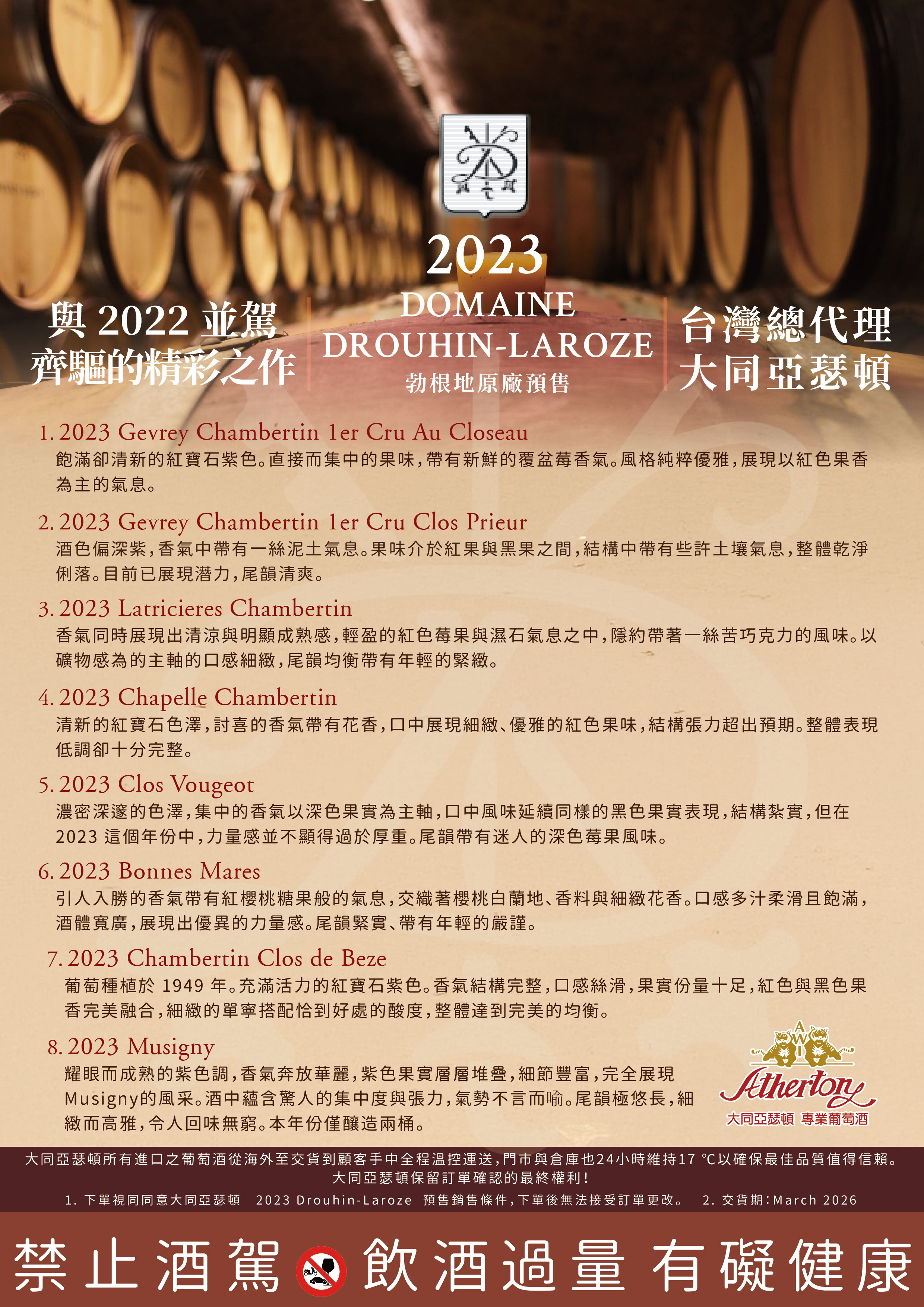 本月大同亞瑟頓推出 2023 Drouhin-Laroze 原廠預售。若說 2022 年份已令人印象深刻,那麼 2023 絕對與之並駕齊驅,同樣美味、同樣值得期待。誠摯邀請您珍藏這個一喝就愛上的精緻酒莊。