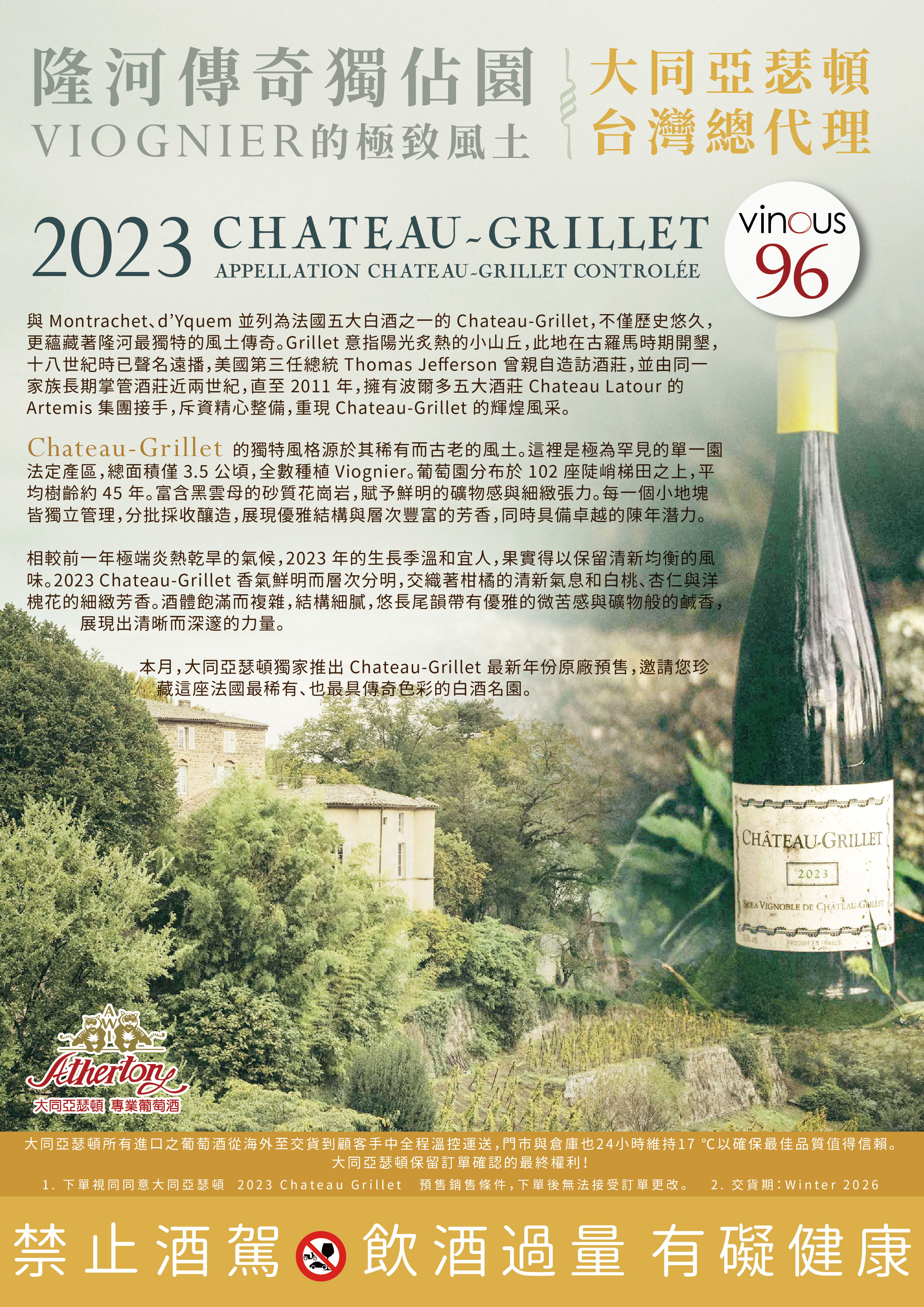 本月,大同亞瑟頓獨家推出 Chateau-Grillet 最新年份原廠預售,邀請您珍藏這座法國最稀有、也最具傳奇色彩的白酒名園。